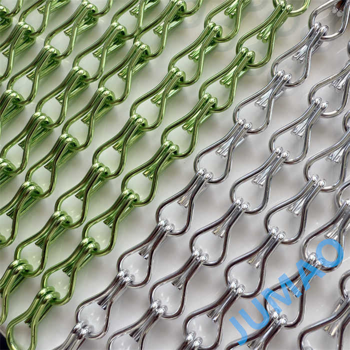 9 মিমি * 16 মিমি, 10 মিমি * 24 মিমি এবং 12 মিমি * 24 মিমি সহ বিভিন্ন চেইন আকারে উপলব্ধ, ধাতব চেইন লিঙ্ক পর্দা বিভিন্ন ডিজাইনের প্রয়োজনীয়তার সাথে খাপ খাইয়ে নেওয়া যায়।তাদের কার্ভযুক্ত আন্ডুলেটেড আকৃতি যে কোন স্পেসে পরিশীলিততা এবং শৈলীর একটি স্পর্শ যোগ করে, যা তাদের জন্য একটি জনপ্রিয় পছন্দ যারা একটি বিবৃতি করতে চান।